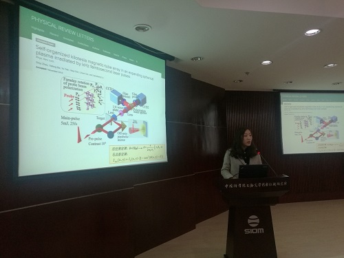 强场激光物理国家重点实验室2016级博士研究生周诗怡作了题为“实验室中的天体物理”的报告。报告首先介绍了强磁场的背景和应用,强磁场在地球生命、太阳系甚至各种天体活动中都扮演着至关重要的角色。随后,她介绍了在实验室中利用千赫兹飞秒激光器驱动固体产生强磁场阵列的原理和方法,详细介绍了实验的测量手段以及对实验结果的处理方法,并展示了自组织磁管阵列的演化合并及放大过程。最后,周诗怡结合自身的经验,分享了文章投稿的一些心得和体会,以及怎么样结合各种作图软件来画出高质量夺人眼球的文章配图,并跟大家分享了通过研究生会工作丰富生活的一些感悟。周诗怡曾获得“IFSA协同创新中心硕士生奖学金一等奖(2015年)”、中国科学院大学“优秀学生干部”(2017年)、“上海光机所优秀志愿者”(2016年)等荣誉称号。