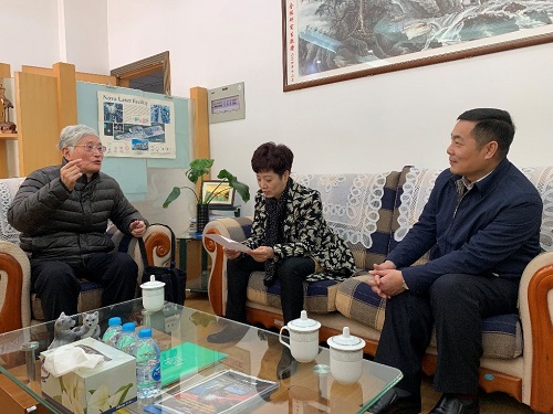 李霞与徐至展院士亲切交谈,关心了解他的工作、生活和身体情况,感谢徐至展院士为我国科技事业做出的重要贡献,并分别代表上海市委统战部给徐至展院士拜早年,向其致以诚挚的问候和新春的祝福。徐至展院士对领导和组织的关怀深表感谢。