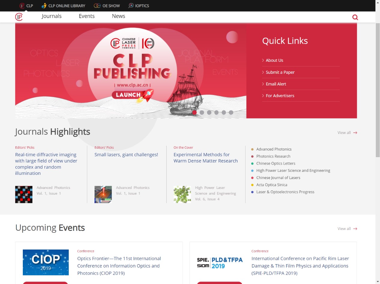 近年来,在中国科协、中科院等主管部门的直接推动下,国内涌现了一大批新创英文期刊。然而,欣欣向荣的英文期刊创办态势,与进展缓慢的国际出版平台建设进度,形成了强烈对比。在中科院传播局的直接指导下,2019年3月26日,上海光机所中国激光杂志社自主建设的CLP Publishing出版平台(http://www.clp.ac.cn)正式上线。这是国内首个面向专业学科期刊集群的英文出版平台。