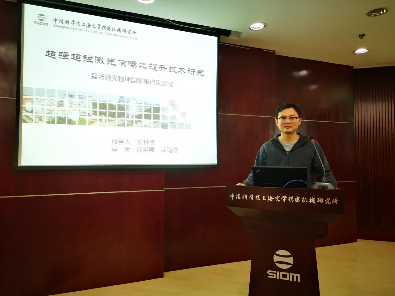 强场激光物理国家重点实验室2016级博士研究生於林鹏作了题为“超强超短激光信噪比提升技术研究”的报告。报告首先介绍了超强超短激光的产生、意义、研究现状,以及上海光机所在超强超短激光领域所取得的研究成果。随后,於林鹏讲述了超强超短激光时域信噪比的重要性,并回顾了提升脉冲信噪比的各项技术。最后,於林鹏跟大家分享了关于科研生活的一些感悟。於林鹏曾获得中国科学院大学“三好学生”、中国科学院大学“优秀学生干部”、中国科学院大学国家奖学金、全国研究生数学建模竞赛二等奖等荣誉。