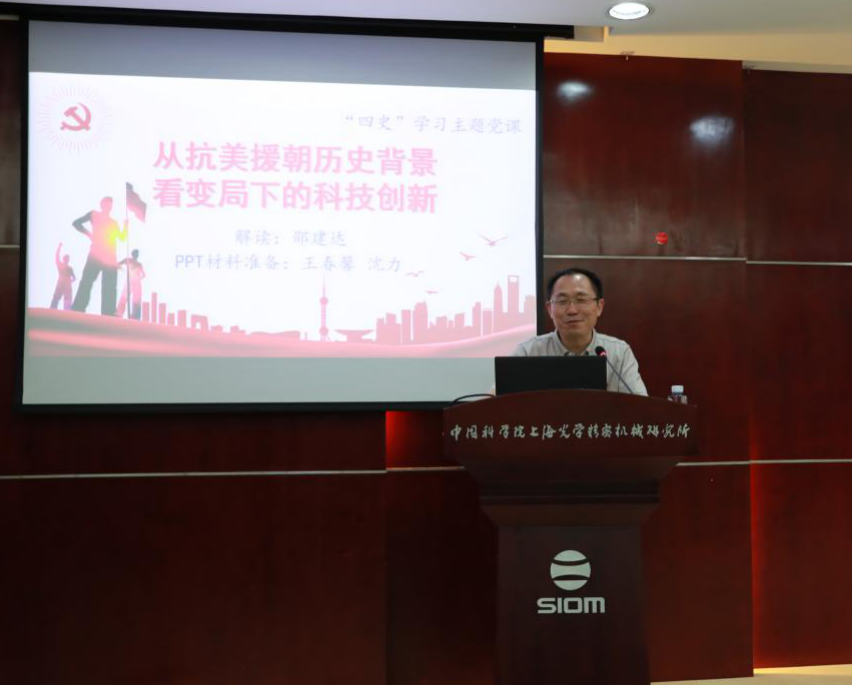 9月9日,中国科学院上海光学精密机械研究所机关一支部、薄膜实验室支部、信光支部与中科院上海实验学校党支部在1号楼羲和厅开展“四史”专题联组学习。上海光机所邵建达所长上了题为“从抗美援朝历史背景看变局下的科技创新”的“四史”学习专题党课。上海光机所党委副书记、纪委书记李燕,中科院上海实验学校夏红梅校长,以及四个支部全体党员和年轻干部理论学习小组成员参加会议。会前,上海光机所机关一支部与中科院上海实验学校党支部举行了党建结对共建签约。