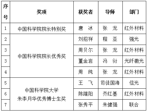 近日,2020年度中国科学院院长奖学金名单公布,中科院上海光机所多名研究生榜上有名。材料学专业博士生唐冰荣获中国科学院院长特别奖,导师张龙研究员获“2020年度中国科学院优秀导师奖”。2014年至2020年,我所已连续7年摘得中国科学院院长特别奖这一院内含金量最高的研究生奖项。