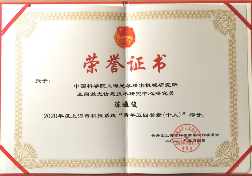 为表彰先进,大力宣传在习近平新时代中国特色社会主义思想指导下,在做强创新引擎和打造自主创新新高地中,作出突出贡献的青年集体和青年典型,引领科技青年站稳人民立场、投身强国伟业,坚定走科技自立自强道路,市科技团工委开展了上海市科技系统青年五四奖章评选工作。上海光机所陈迪俊研究员荣获“2020年度上海市科技系统青年五四奖章(个人)”。