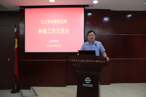 10月11日,九三学社普陀区委副主委任颖清等一行到中国科学院上海光学精密机械研究所调研科普工作,上海光机所所办公室副主任王宁,中科院量子光学重点实验室研究员屈求智出席。本次会议由九三学社上海光机所支社主委魏荣研究员主持。