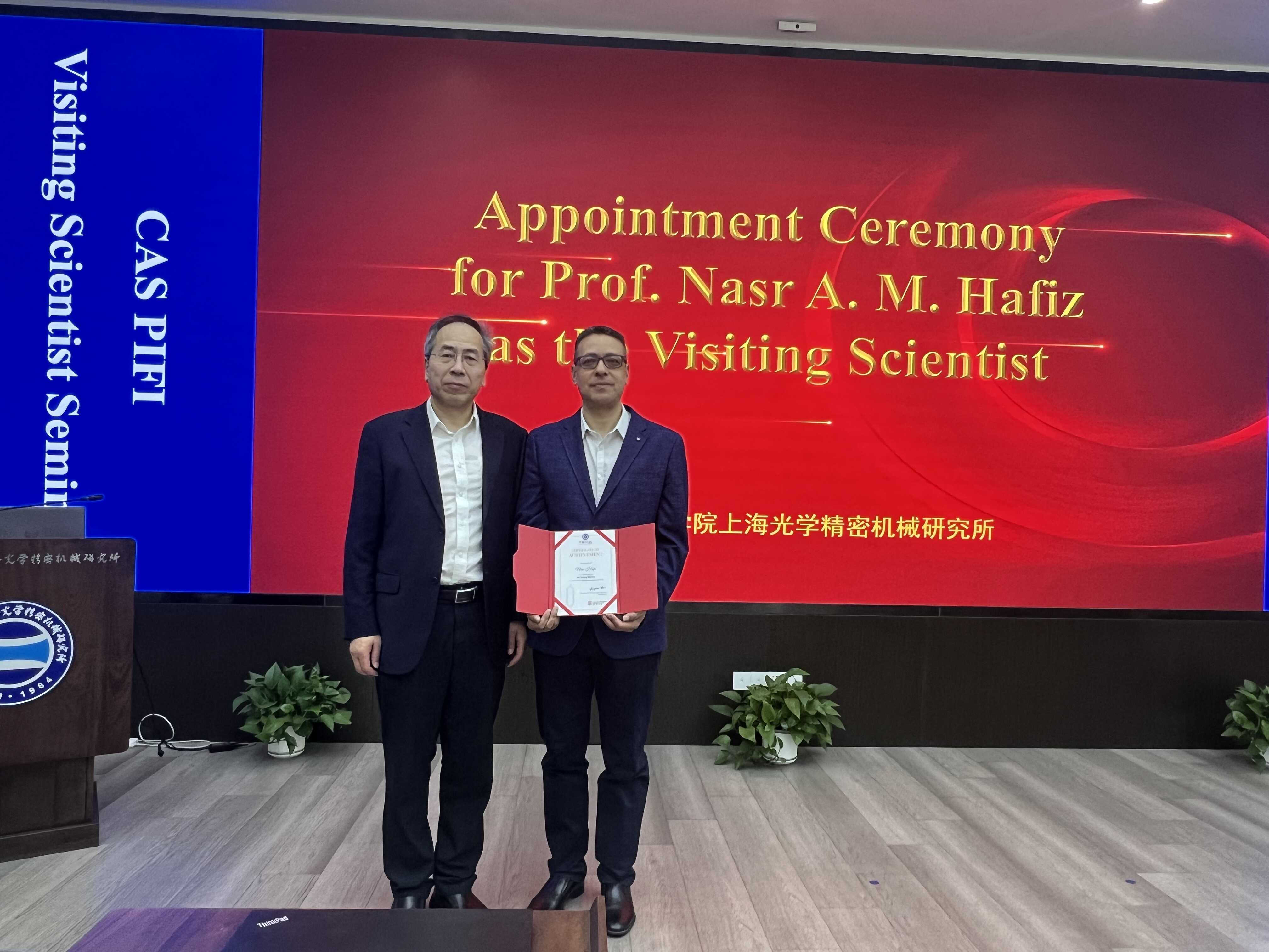 陈卫标向Nasr教授颁发中国科学院访问学者证书,对Nasr教授的来访表示热烈欢迎,期待未来双方在前沿领域进一步深化交流、加强合作,共同攻克技术难题,产出一批具有国际影响力的高质量科技成果,为推动相关领域的发展贡献智慧与力量 。