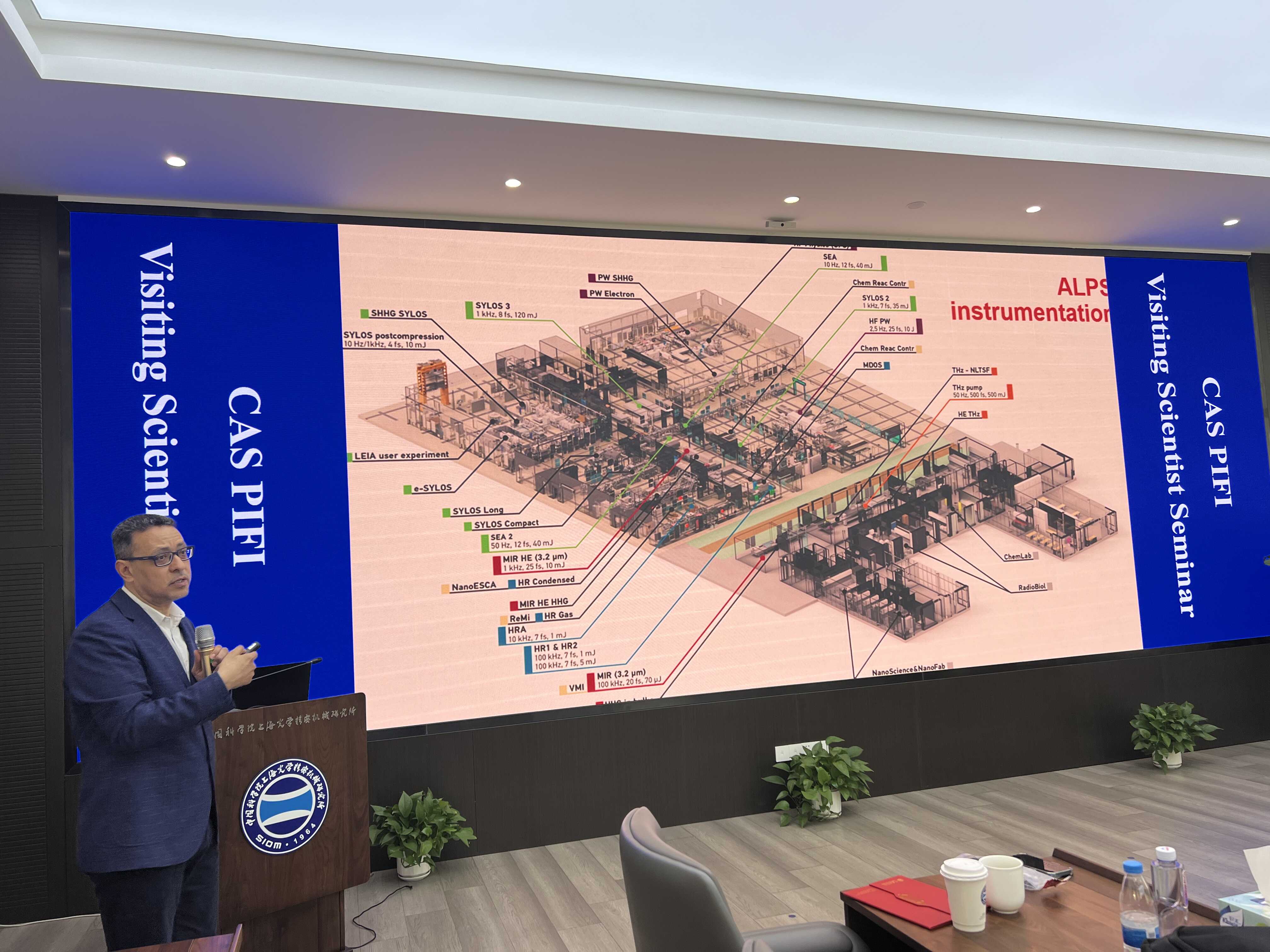 报告环节,Nasr教授介绍了匈牙利ELI-ALPS实验设施内部激光装置以及实验大厅的最新进展,特别是eSYLOS束线和ePW 束线的运行状态以及实验参数,并就近期开展的实验所取得的进展做了详细的介绍,包括运用kHz的SYLOS激光开展基于激光尾波场加速的高能电子束产生实验,以及将该电子束用于粒子束生物辐照研究的相关实验结果。此外,团队还开展了大量基于PIC的理论模拟研究,如激光驱动等离子体通道研究、GeV高能电子束产生等。会上,Nasr教授还对此次来访问交流将开展的研究内容做了介绍。