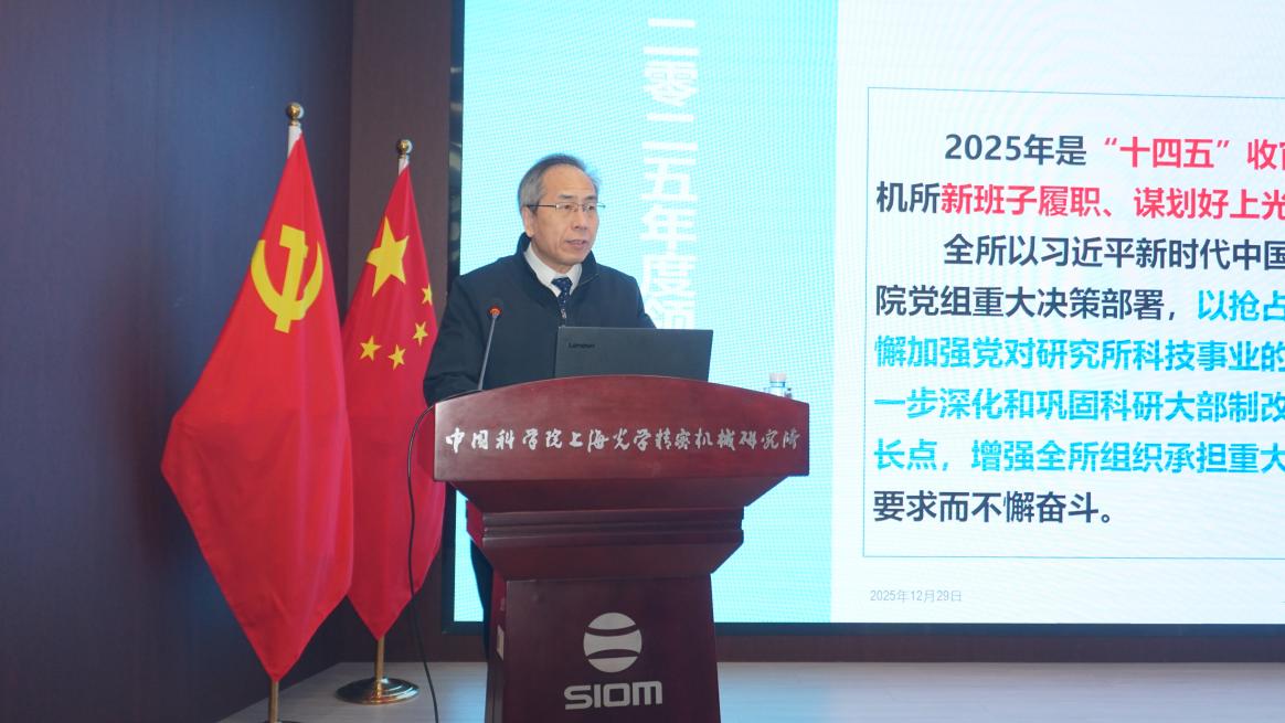 张龙所长主持会议并讲话,他指出2025年新一届领导班子团结带领全所职工,加强党的全面领导,在规划“十五五”、推进重点领域布局、组织重大科技任务、突破关键核心技术、加强人才队伍建设等方面取得系列成效,为“十四五”收官画上了圆满句号。他强调本次大会既是系统总结上海光机所年度工作进展,更是为了进一步统一思想、凝聚共识,为“十五五”规划的谋篇布局注入强劲动力。他希望,全所职工要进一步强化“国家队”“国家人”的职责使命,以抢占科技制高点为核心任务,团结一心、锐意进取,确保“十五五”开好局、起好步。