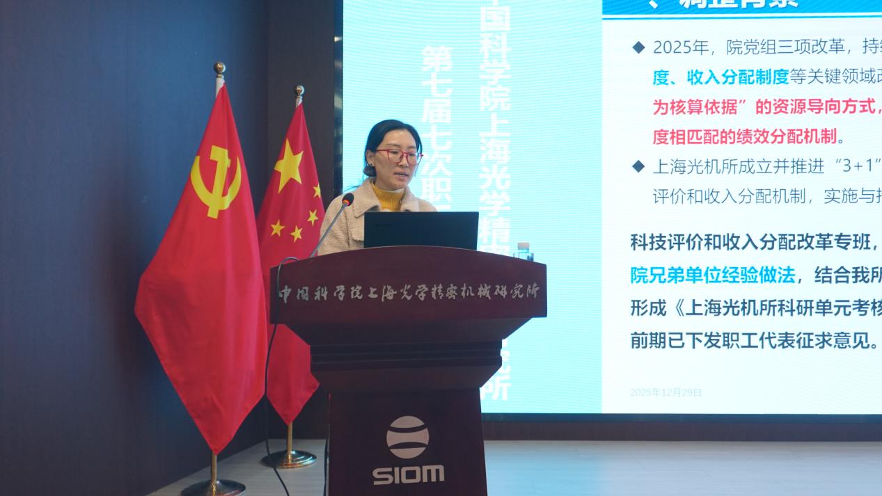 12月29日,中国科学院上海光学精密机械研究所召开第七届七次职工代表大会。本次会议主要审议“上海光机所‘十五五’战略规划”,“上海光机所‘新三定’职能与支撑部门优化方案”,“科研单元考核及总绩效核定细则(试行)”,“研究所项目聘用职工转事业编制、新职工定岗定级、工作人员考核办法”等。上海光机所领导班子成员、党委委员、所务委员、纪委委员、学术委员会委员、中层干部、科研单元负责人、支部书记、群团负责人、专业技术骨干、职工代表等共计100余人参会。会议由上海光机所副所长、工会主席邵宇川主持。