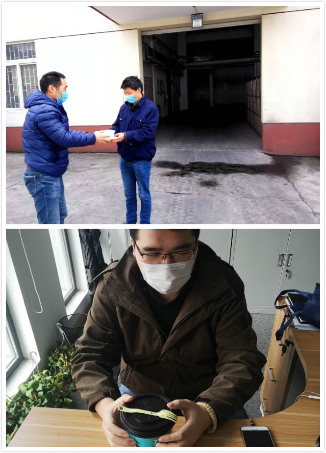 上图:公司指定人员在指定地点取餐;下图:一人一桌,办公室就餐