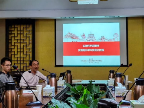支部书记徐震给大家上了一堂题为“弘扬科学家精神,实现高水平科技自立自强”的党课,深入学习习近平总书记和侯建国院长在两院院士大会上的重要讲话,并解读了科学家精神的内涵。徐震强调,科学家精神是新时代实现高水平科技自立自强,把我国建成一个科技强国的重要的精神支撑,我们要深入学习领会习近平总书记对科学家提出的“四个表率”的要求,从老科学家们在科研工作和人生抉择中的感人事迹中汲取奋进力量。徐震指出,作为一名科研人员,应具备新时代科学家精神,要时刻怀有国家情怀,淡泊名利,不甘寂寞,为我国科技强国建设贡献力量。