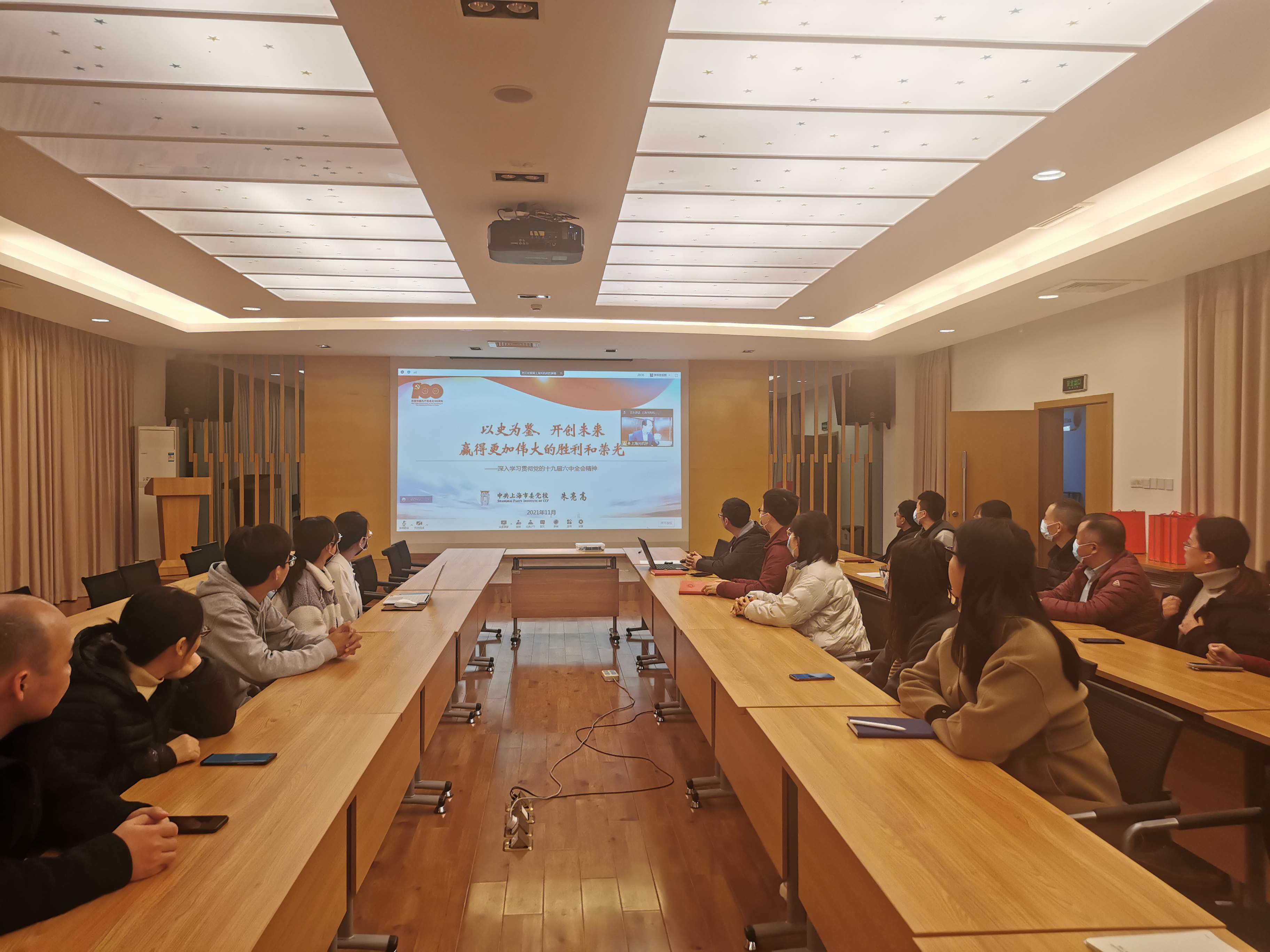 支部全体党员收听了由中共上海市委党校副校长朱亮高就深入学习贯彻党的十九届六中全会精神做专题报告。报告以“以史为鉴、开创未来,赢得更加伟大的胜利和荣光”为主题,梳理了党的十九届六中全会中包括“四个历史时期”、“四个伟大成就”等13个核心要义,明确了该会议是在党百年华诞的重要时刻,在“两个一百年”奋斗目标历史交汇关键节点上召开的一次具有重大历史意义的会议,指出了党的十九届六中全会的最大成就等。