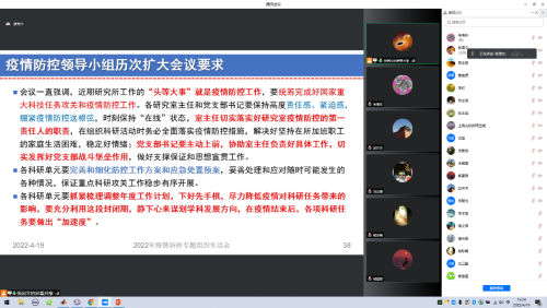 2022年4月19日晚19:00,高功率激光物理联合实验室联第一党支部采用网络视频的方式开展疫情防控主题党日活动。上海光机所副所长、党委委员李学春等支部24名党员参加了会议。会议由支部书记张国文主持。