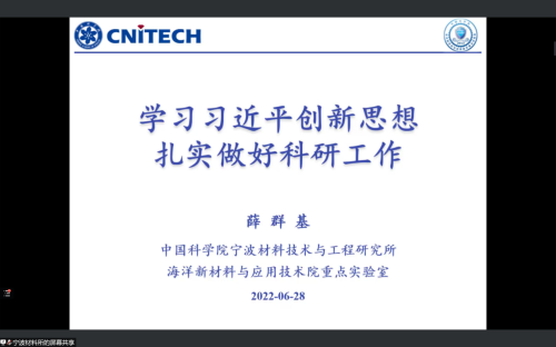 6月28日下午,单元党支部开展主题党日活动,组织全体职工、研究生同时以线上和线下的方式,参与观看由中科院党的建设工作领导小组办公室、上海分院分党组举办的中科院科技价值观报告会暨上海分院第四期“报国讲坛”。本次讲坛,中国工程院院士薛群作了题为《学习习近平创新思想,扎实做好科研工作》的报告,活动由中国科学院上海分院分党组副书记王东主持。