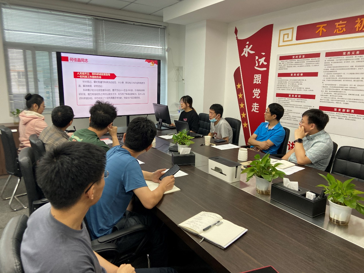 第一党小组组长金森作总结发言:一是要进一步加强对学术不端行为具体概念以及规避方法的学习;二是要规范实验记录、核查原始数据、遵守引文规定,从源头杜绝学术不端行为;三是要用严谨的科学态度从事科学工作,以追求真理为宗旨从事科学研究。第二党小组组长王艳作总结发言:作为科研工作者,必须从科研诚信要求、科研伦理规范、科研经费管理等方面进行深刻的反思和学习,提高科研精神和思维方式,增加克服困难和开拓创新的勇气和信心,发挥自己的潜力和能力,为社会和科技的发展做出重要的贡献。第三党小组组长徐畅作总结发言:在实际工作中,应更加认真执行科研诚信、伦理规范和经费管理准则,从多个维度贯彻落实相关文件和政策,保证科学研究的公正性、内涵性、质量性。同时有效监督发挥科研成果价值,实现高质量的科学工作。第四党小组组长杜嘉结合学习习近平总书记的《论科技自立自强》感受作总结发言:作为一名科研工作者,应该保持不断学习的态度,充分认识到科技自立自强的重要性,积极探索科研的新领域,不断提升自己的科技创新能力。