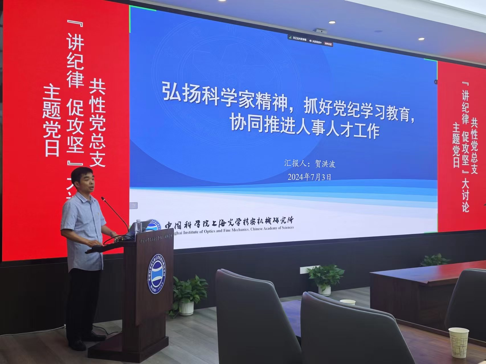 在“凝精神”阶段,共性党总支于7月3日组织召开了“讲纪律·促攻坚”主题党日活动,本次活动设置王大珩厅主会场、视频分会场,共性部党员、团员共计100余人参加本次活动。活动由共性党总支书记李冰欧主持。党委委员、人力资源部部长贺洪波应邀出席并作专题报告。