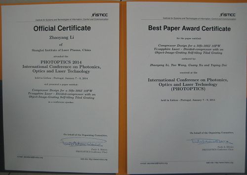 1月7-9日PHOTOPTICS 2014第二届光子、光学和激光技术国际会议(PHOTOPTICS 2014, 2nd International Conference on Photonics, Optics and Laser Technology)在葡萄牙里斯本举行,上海光机所高功率激光物理联合实验室李朝阳助理研究员、徐光研究员等的学术论文“Compressor Design for a 30fs-300J 10pW Ti:sapphire Laser—— Divided-compressor with an Object-image-grating Self-tiling Tiled Grating”(30飞秒300焦耳10拍瓦钛宝石激光压缩器设计——采用物像光栅自拼接拼接光栅的分布式压缩器)获大会2014年度唯一的“最佳论文奖”。