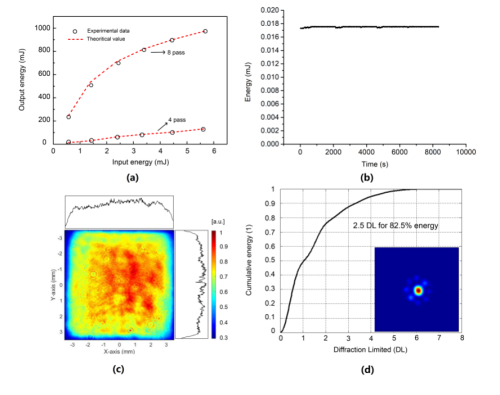 LD泵浦的焦耳级钕玻璃激光放大器由于其热效应小,可靠性高,可重复频率运行等优点,有望被应用于ICF高功率激光装置的预放大系统中,但是目前光-光效率基本在3%~5%左右。为此,研究人员针对性地提出了LD端面泵浦钕玻璃方棒的方案,通过优化设计激光增益模块,增大信号光与泵浦光束的交叠面积,同时采用基于像传递的同轴八程放大结构,实现了~1 J激光能量输出, 光-光效率达10%,输出能量稳定性为2.5%(P-V),近场调制度1.37,82.5%的远场能量集中于2.5倍的衍射极限内。本研究为进一步发展大能量高效重复频率钕玻璃放大器打下了扎实的研究基础。