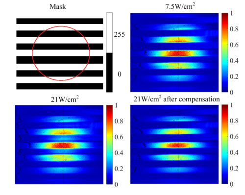 研究人员对OASLMs在高功率激光下的损伤机理和性能退化进行了分析,并提出了一种性能退化的补偿方法。OASLMs在激光辐照下的产生热量主要沉积在导电膜层-ITO和光电导层-硅酸铋(BSO)的位置,从而引起液晶的温升,使其有效双折射率发生改变,最终导致OASLMs的对光束的调控能力降低。通过适当的降低OASLMs的驱动电压,同时提升其写入光的电流,液晶层的分压在低灰阶和高灰阶下均能保持在最佳范围内,可有效的补偿OASLMs因温升引起的性能退化。通过这种补偿方式可以使OASLMs在连续激光下的损伤阈值从7.5W/cm2提升至20W/cm2,同时仍保持较好的光束调控能力,开关比大于100:1,透过率高于85%。