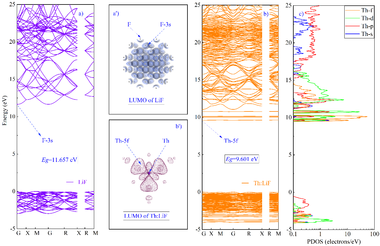 研究采用基于密度泛函理论的第一性原理方法,预测了Th:LiF单晶作为一种新型固体核光钟材料的可行性及潜力。理论研究表明,在Th:LiF晶体中通过合适的电荷补偿机制可以实现Th离子的有效掺杂,同时不会造成晶体在核跃迁波段透过率的明显下降,有利于核跃迁的激发和探测。在此基础上,研究团队采用提拉法首次生长了232Th:LiF单晶,实验表明,其Th掺杂浓度~8.3×1018 cm-3,1mm厚晶体样品的透过率可达T=68%@152.7 nm,与在类似条件下生长的相同尺寸的纯LiF晶体样品(T=72%@152.7 nm)相比仅略微下降,有利于增强核跃迁信号。
