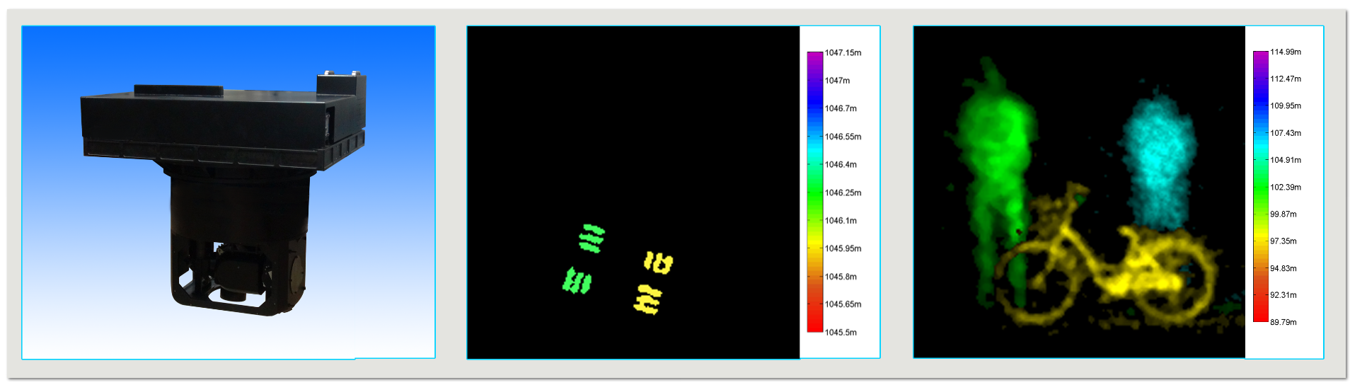 左图为机载激光三维强度关联成像试验样机 ,中图为机载试验结果,右图为车载试验结果