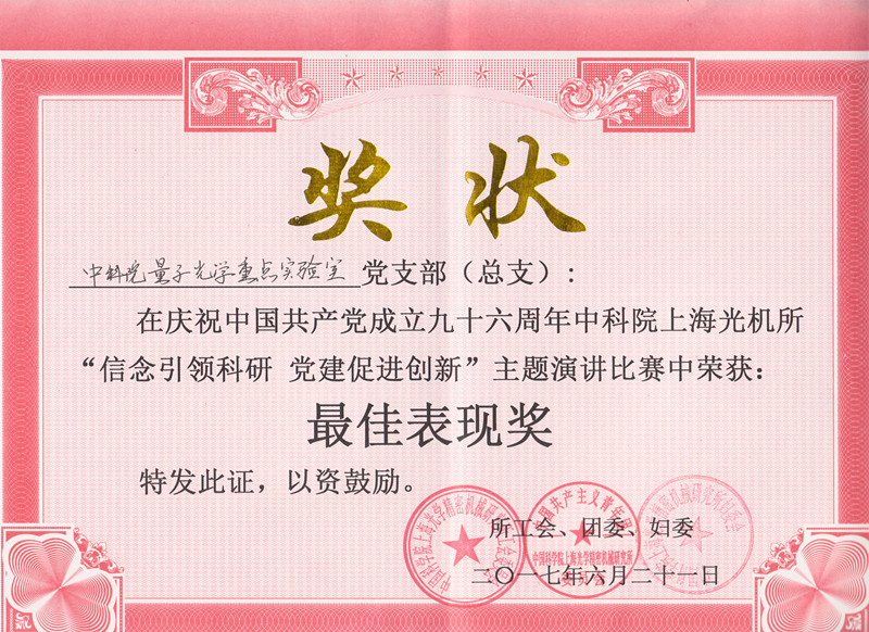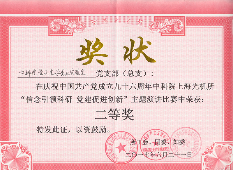 2017年6月21日,上海光机所庆祝中国共产党成立九十六周年“信念引领科研 党建促进创新”主题演讲比赛在多功能厅举行,中科院量子光学重点实验室党支部精心组织了以“筑梦天宫”为主题的演讲,荣获演讲比赛二等奖,并凭借出色的发挥赢得了专家评委评出的最佳表现奖。