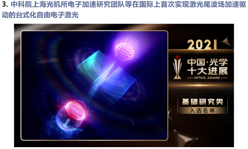 还有一项成果 “GeV量级超低能散的台式化电子加速器”(2021年5月发表于Physical Review Letters)入选2021中国光学十大进展”提名奖(应用研究类),其中冯珂为共同一作,王文涛为通讯作者,许毅为共同作者。