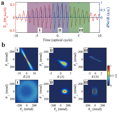 图2展示了不同空间分布电子在光场相位下分布及空间分布。周期性发射的阿秒电子脉冲在激光场调制下形成了条纹结构分布,这一作用过程把电子按时间的先后顺序转换成了空间投影,根据电子空间分布可直接反演其阿秒时间动力学过程。
