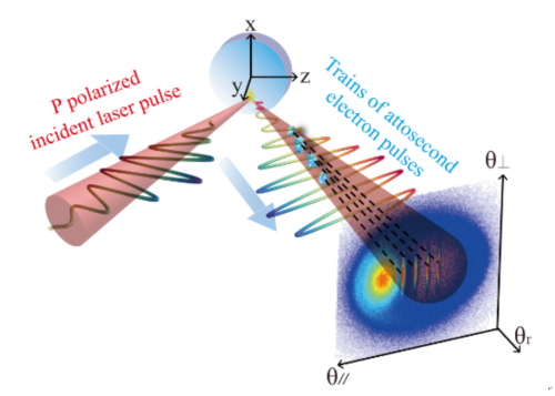 强场激光物理国家重点实验室创新发展了XPWG+OPA [Opt. Express 26, 2625-2633 (2018)]等技术有效提升现有百太瓦和拍瓦级超强超短激光系统时间对比度,相应技术已进一步应用于国家重大基础设施上海超强超短激光实验装置(SULF)[High Power Laser Sci. Eng. 8, e4 (2020)]。在该实验中,研究人员利用高对比度的800nm飞秒激光脉冲聚焦到反射镜面上,如图1所示,电子在激光锁定相位下以阿秒电子脉冲链形式出射,解决了激光光场-阿秒电子脉冲之间的精确时空同步的难题。