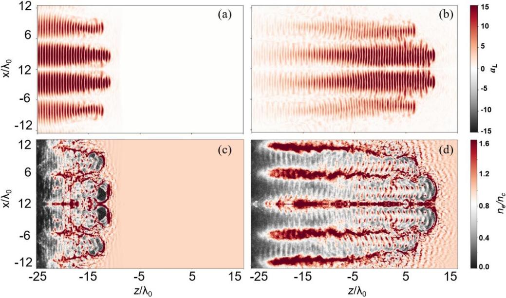 图2.等离子体多通道Betatron振荡的时空演化图,(a)和(b)为92fs和184fs时的归一化激光振幅aL、(c)和(d)为92fs和184fs时的电子密度分布。