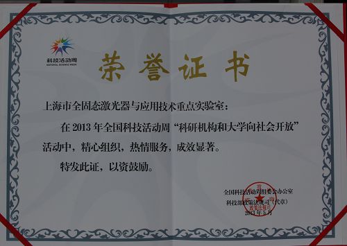 11月14日,全国科技活动周组委会办公室向上海光机所空间激光信息技术研究中心上海市全固态激光器与应用技术重点实验室发来感谢信和荣誉证书,以表彰该实验室在“科研机构和大学向社会开放”活动中积极参与,组织得力。