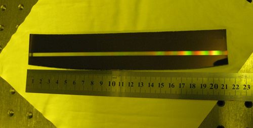 研制成功的高精度长程光栅照片:(a) 光栅长度210mm; (b)显微图片,光栅周期5µm,周期均匀性实验控制精度优于0.03nm。