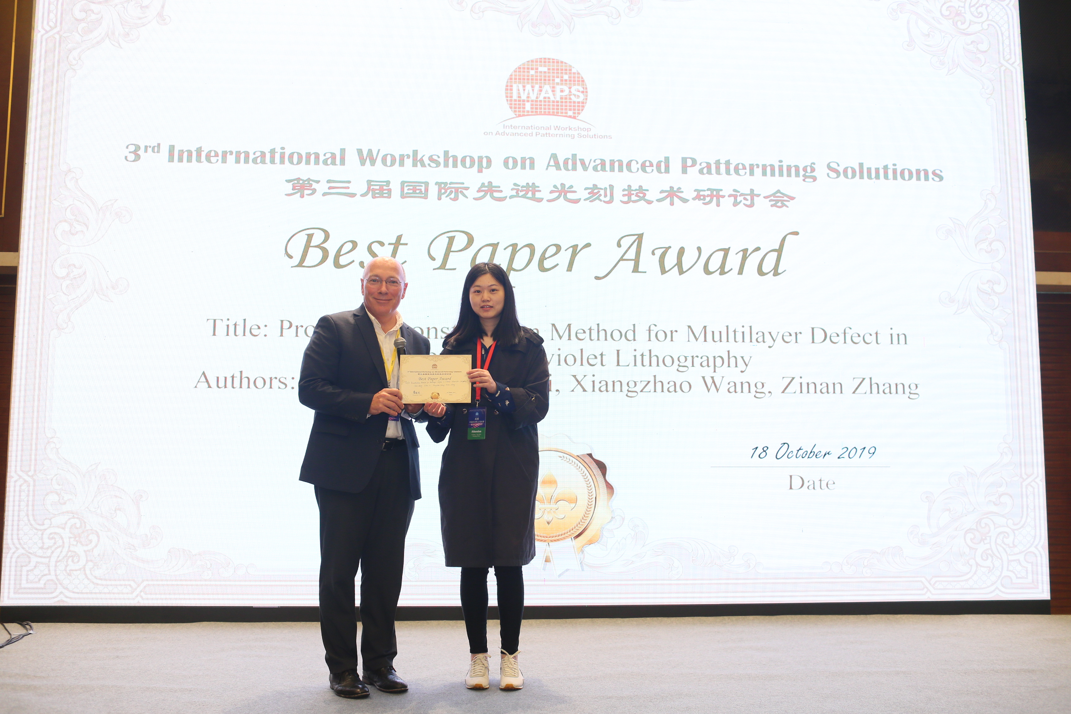 我所王向朝研究员带领团队参加了会议并担任国际咨询委员会委员、大会session chair。上海光机所在本次会议上共发表5篇学术论文,其中论文“Wei Cheng, Sikun Li*, Xiangzhao Wang*, Zinan Zhang,Profile reconstruction method for multilayer defect in Extreme Ultraviolet Lithography, the 3rd International Workshop on Advanced Patterning Solutions (IWAPS2019),Nanjing China,17-18 Oct,2019”被评为大会唯一最佳论文,获Best Paper Award。