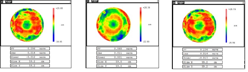 图1.最优透过标准镜面形 (左)、最优反射标准镜面形 (中)、最优空腔配修指标(右)