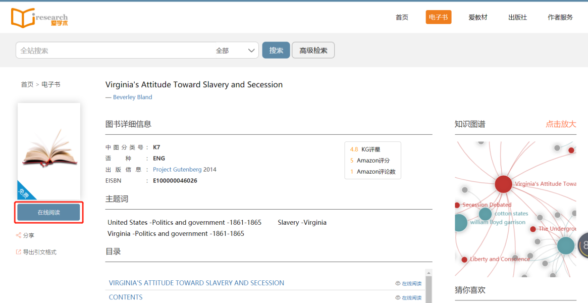 → 访问平台首页www.iresearchbook.cn,点击右上角的电子书