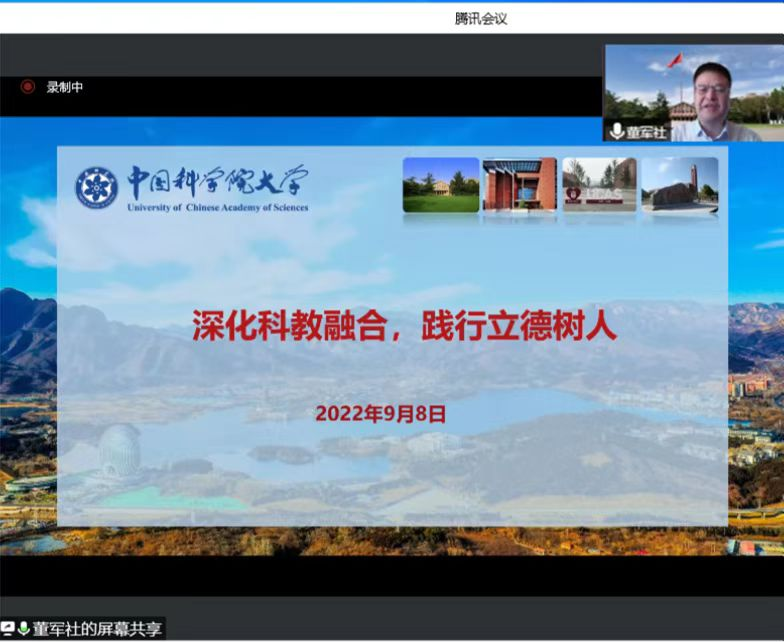 董军社在线上作《深化科教融合,践行立德树人》专题报告,为我们全面介绍了国科大科教融合的初创与探索,发展与创新,介绍了国科大的师资队伍、教育教学、学科建设、教育基金会、校园文化建设等方面的情况。他强调,国科大新时代的使命是不断深化和创新科教融合办学特色,为国家、中科院培养未来科技创新人才和领军人才,培养合格的社会主义建设者和接班人。