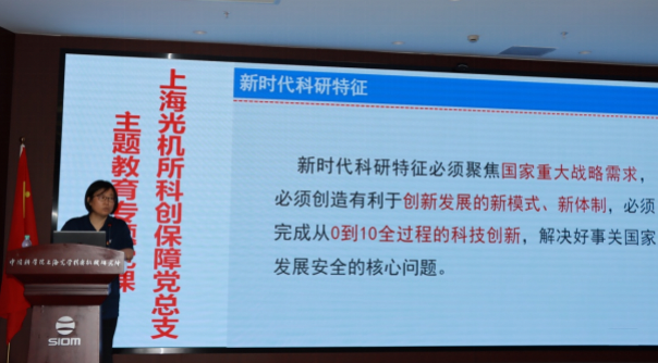 会前,党委委员、航天激光工程部主任侯霞向全体科创保障党总支党员上了题为《如何在充分考虑新时代科研特征前提下,贯通基础、技术和工程瓶颈,充分利用社会、资本资源为国家重大需求服务》专题党课。她领学了近期党中央关于科技创新的重要精神、对上海光机所主题教育进展及成效进行了宣贯,重点围绕协管调研课题情况及转化成果进行了介绍。她表示,上海光机所将在持续聚焦主责主业的同时,积极适应新时代科技成果转移转化的特征,进一步创新发展思维和范式,用科技成果的高质量转移转化更好地服务和推动主责主业高质量发展。