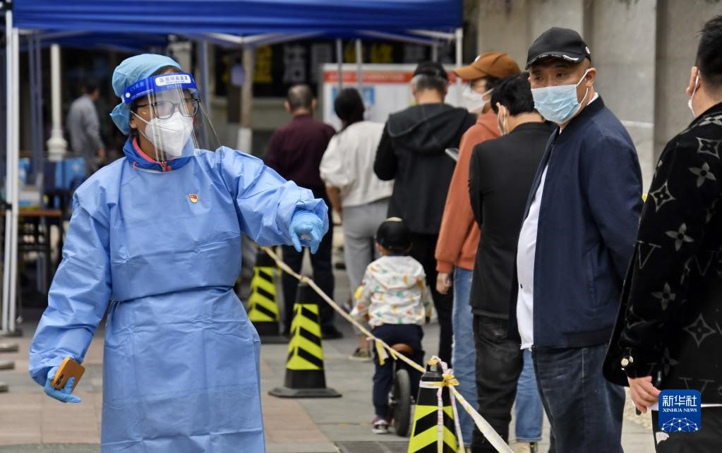 共产党员、北京八里庄街道机关干部张茜(左)在核酸筛查现场进行秩序维护(2022年5月11日摄)。新华社记者 李欣 摄