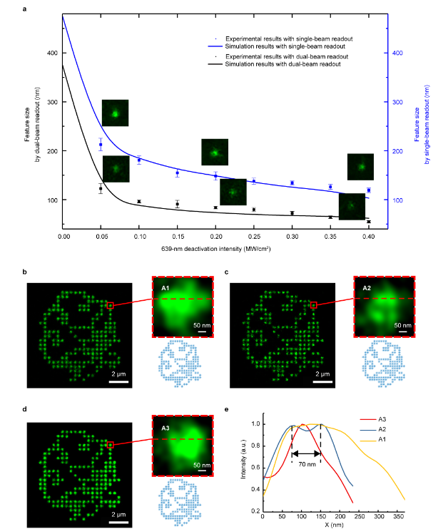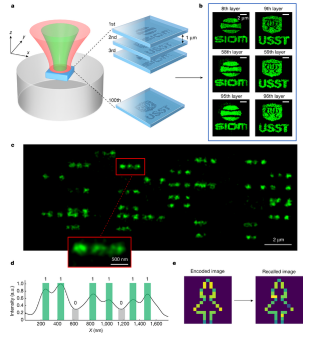 近日,中国科学院上海光学精密机械研究所(以下简称“上海光机所”)与上海理工大学等科研单位合作,在超大容量超分辨三维光存储研究中取得突破性进展。研究团队利用国际首创的双光束调控聚集诱导发光超分辨光存储技术,实验上首次在信息写入和读出均突破了衍射极限的限制,实现了点尺寸为54nm、道间距为70nm的超分辨数据存储,并完成了100层的多层记录,单盘等效容量达Pb量级,对于我国在信息存储领域突破关键核心技术、实现数字经济的可持续发展具有重大意义。相关研究成果于2024年2月22日发表在《自然》(Nature)杂志。论文第一作者单位为上海光机所,通讯作者为上海光机所阮昊研究员和上海理工大学光子芯片研究院院长顾敏院士,上海理工大学文静教授。上海光机所博士后赵苗和上海理工大学文静教授为并列第一作者。