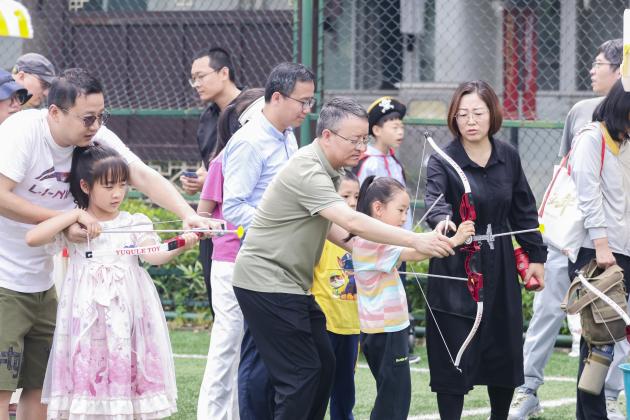 在亲子趣味游戏,一个个丰富多彩的家庭日小游戏将儿童节的欢乐氛围推向高潮。近200组家庭相聚在足球场,通过趣味套圈、百发百中、笑掉大牙、飞镖气球等游戏,进一步增进着亲子间的情感互动,同时提升了孩子们的动手能力,增强了自信心和表现力。
