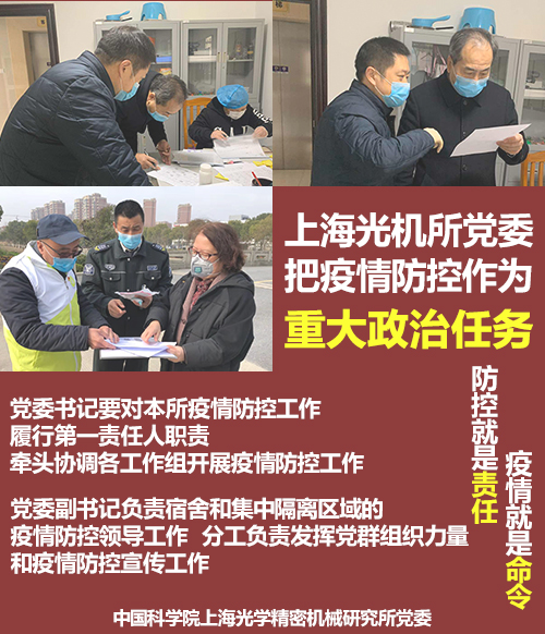 上海光机所党委制订《防控工作党组织联络值守机制方案》,从所党委、党委办公室、各党支部三个层面落实责任和分工。全体党支部书记积极承担责任,主动配合部门行政负责人落实好各项部署安排,做实做细各项防控措施。