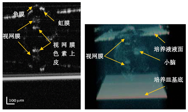 图3 斑马鱼胚胎头部眼睛部位的二维(左)及三维(右)在体层析成像结果