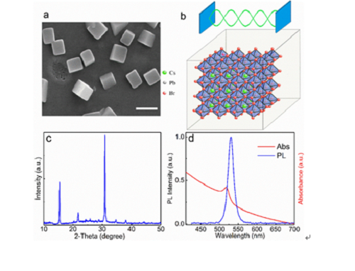 图1 立方体钙钛矿光学性能表征。a)TEM形貌图。b)晶体结构及微腔示意图。c) XRD谱图。d)吸收谱和荧光谱。