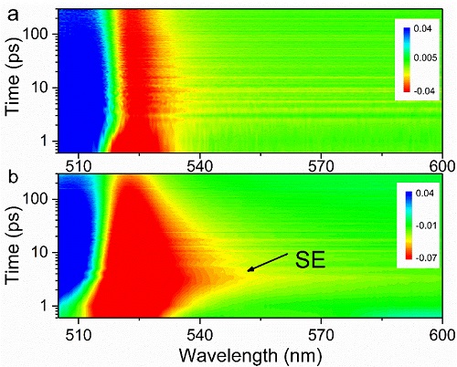 图3 阈值上下瞬态吸收谱。a)阈值下。b)阈值上。