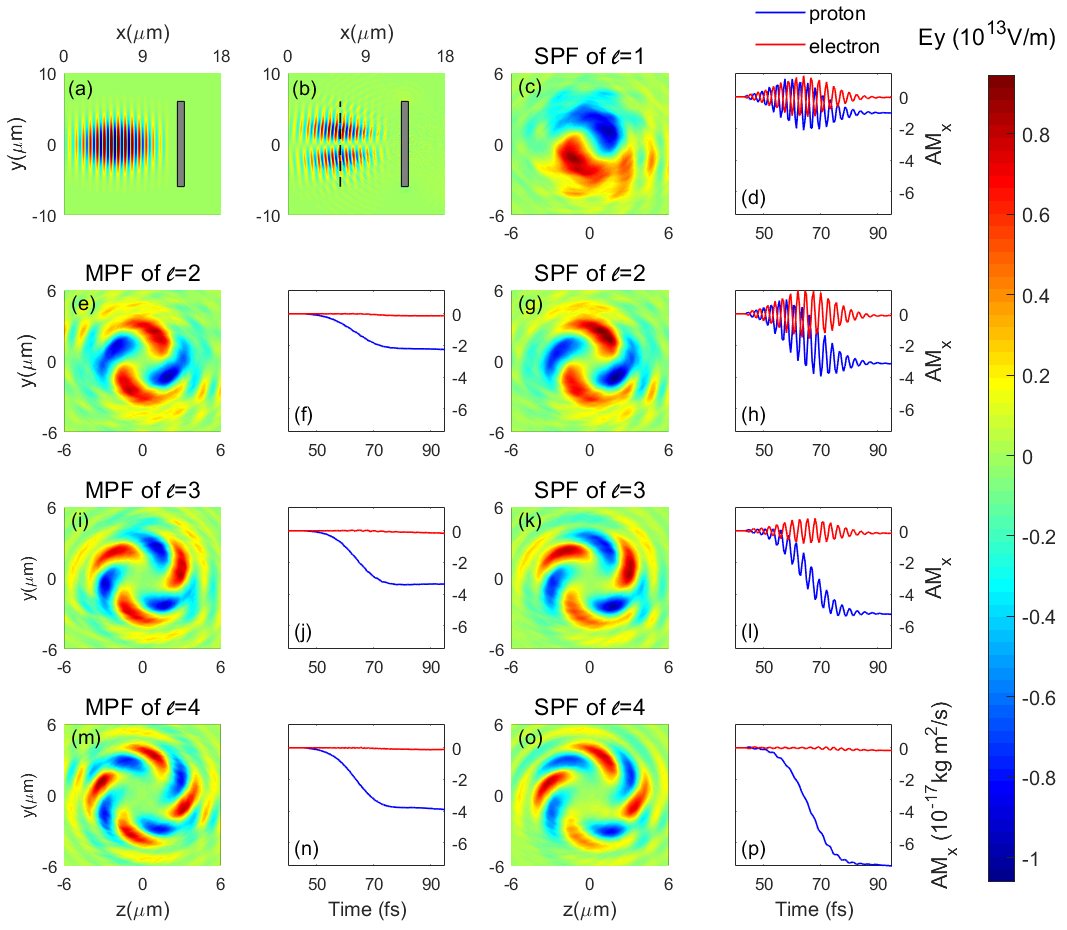 图2 用两个不同系列的等离子体螺旋相位板(SPF和MPF)产生具有不同拓扑荷的涡旋光束和靶内粒子的角动量振荡效应