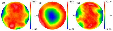 图2 Φ600mm口径干涉仪标准透射平晶A(a)、标准反射平晶B(b)以及辅助平晶C(c)的绝对面形误差结果