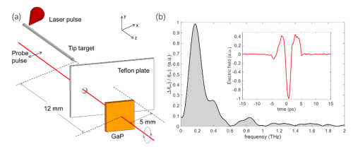 图1(a)实验装置;(b)太赫兹谱及时域波形(插图)