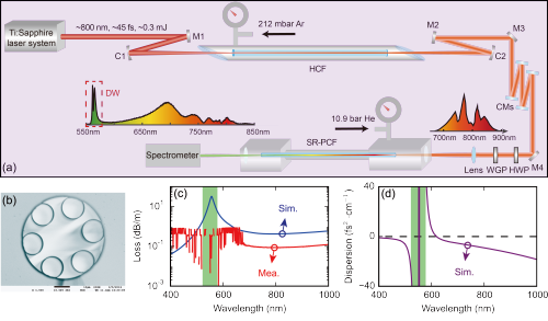 图1 实验光路(a)以及反谐振空芯光子晶体光纤的SEM(b)、损耗(c)和色散(d)