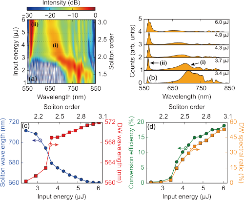 研究团队自2018年以来系统地研究了反谐振空芯光子晶体光纤中的孤子-等离子体相互作用,取得了一系列高质量的研究成果。其中包括:实现蓝移孤子中心波长连续调谐,实现蓝移孤子谱宽调谐,以及验证绝热孤子自压缩现象等。在本研究中,研究团队利用等离子体驱动的蓝移孤子在光纤的谐振光谱区产生了高效率色散波辐射。系统输出的色散波光谱比例高达~53%,对应~19%的整体能量转换效率,这是迄今为止利用光纤谐振区产生色散波辐射的转换效率记录。