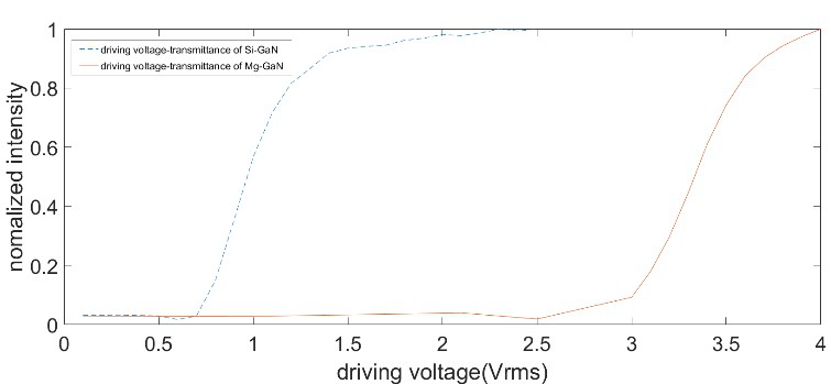 图1 氮化镓光开关的响应曲线,蓝色虚线为掺硅氮化镓光开关,红色实线为掺镁氮化镓光开关。两者的开关比均达到了30:1以上。