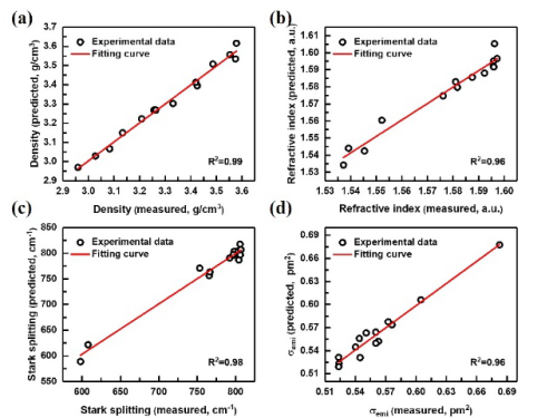 磷锗酸盐玻璃实测性质与基于O-1s XPS结构-性质模型预测性质的比较图:(a)密度;(b)折射率;(c)Stark分裂;(d)发射截面。